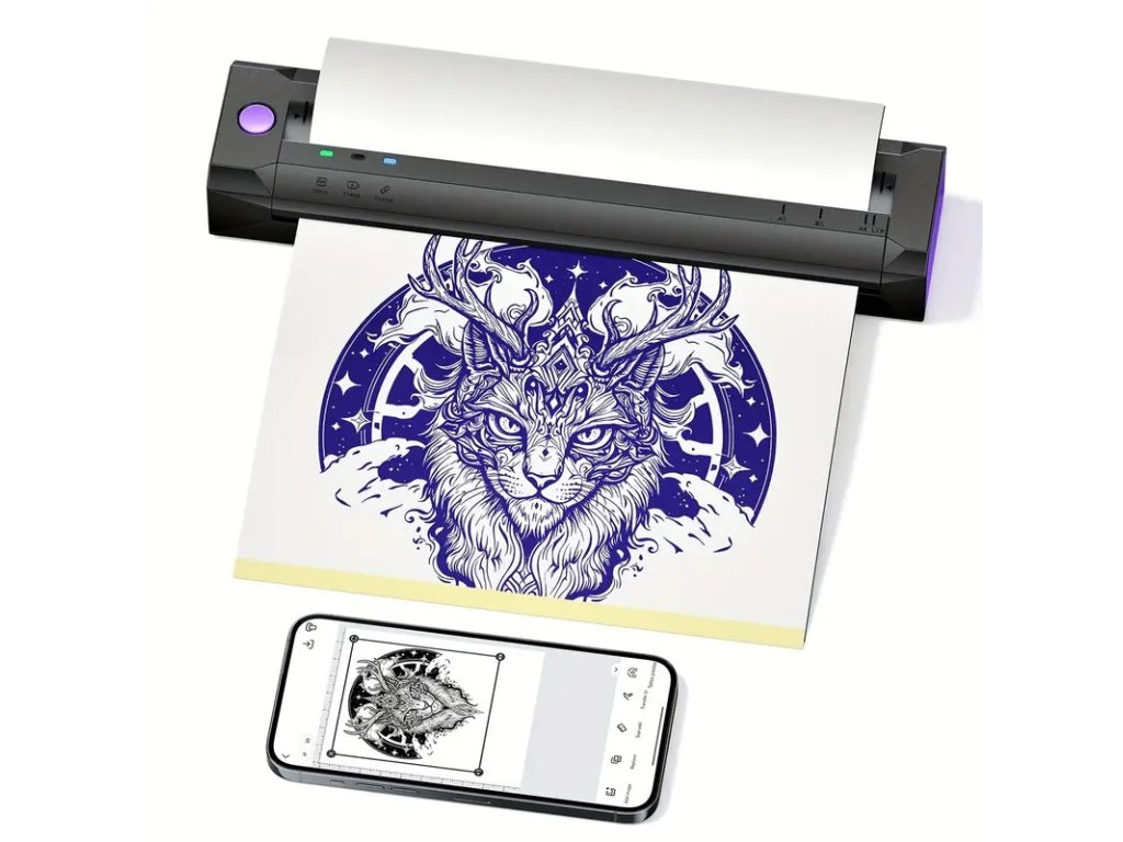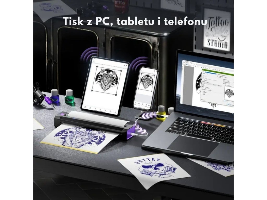 Přenosná termální tiskárna A881U je navržena pro snadný a kvalitní tisk tetovacích šablon bez použití inkoustu. Tiskne bezdrátově z mobilní aplikace Phomemo (Android/iOS) nebo přes USB-C kabel z počítače (Windows/macOS). Aplikace je dostupná v češtině a nabízí intuitivní ovládání.