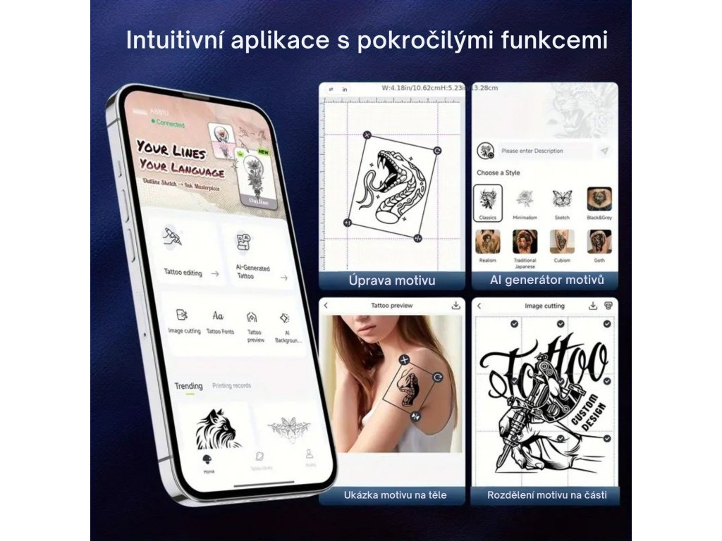 - Funkce aplikace: Generování motivů pomocí umělé inteligence, rozdělení velkých motivů na části, editace motivů, vyobrazení motivů na kůži a další.